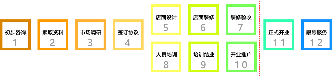 方案二:总部对加盟商进行远程视频教学 → 在线解决加盟商所有问题试营业 → 开业支持 → 正式开业 → 跟踪服务